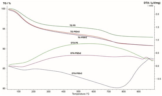 The results of the thermogravimetric and differential thermal analyses obtained for the P5, P5Zn2, and P5Sr2 bioglasses are shown in Figure 1. The changes seen in the TG curve correspond to the thermal processes reflected in the DTA curve. When the samples were heated from room temperature to 1000 °C, a greater weight loss was observed in the TG curve for the P5Zn2 and P5Sr2 bioglasses than for the P5 bioglass.