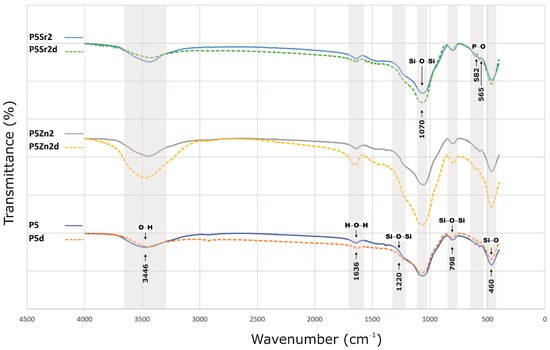 The bioglasses produced were characterised via infrared spectroscopy. Regardless of the thermal treatment parameters, the same absorption bands were observed, characteristic for glasses produced via the sol-gel method. The FTIR spectra of the bioactive glasses P5, P5Zn2, and P5Sr2 heated at 550 °C/3 h and P5d, P5Zn2d, and P5Sr2d heated at 650 °C/10 h are shown as representatives (Figure 2). Regardless of the thermal treatment parameters, the same absorption bands were observed, characteristic for glasses produced via the sol-gel method. On the spectra, the characteristic band between 3700 and 3100 cm−1 was observed, and it was assigned to the stretching vibration of the hydroxyl groups: overlapped silanol groups (Si-OH) and HO-H bonds in adsorbed water molecules. Weak bands attributed to H-O-H deformation vibrations were also observed at 1636 cm−1. The wide bands at 1220 cm−1 and 1070 cm−1 were associated with asymmetric stretching vibrations in the Si-O-Si in the tetrahedra, and the wide band at 798 cm−1 was attributed to the symmetric stretching vibration of Si-O-Si. The low-intensity band attributed to the P-O asymmetric bending vibrations of the PO43− groups was observed at ca. 565 cm−1 and 582 cm−1. The broad band at 460 cm−1 is associated with the bending vibration of Si-O-Si bonds. All of the observed spectra for the tested bioglasses are similar, and only slight differences in the band intensity of the spectra can be observed.