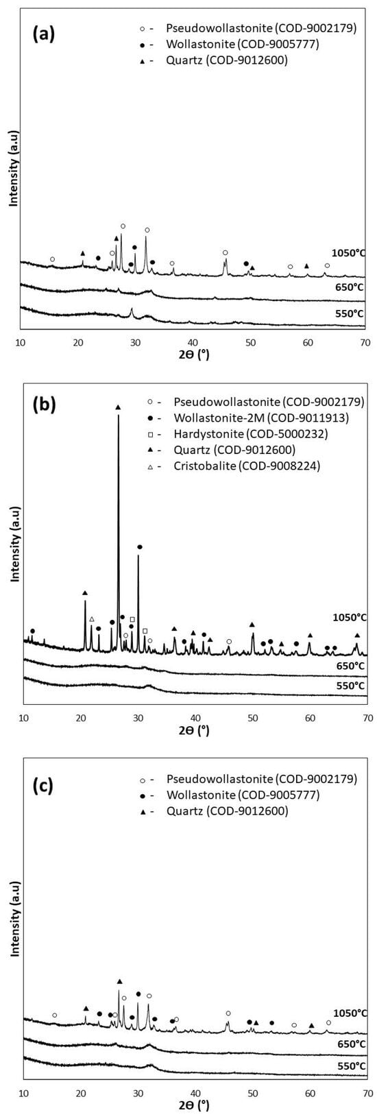 XRD analysis of bioglasses after treatment at 550 °C/3 h, 650 °C/10 h, and 1050 °C/5 h: (a) P5, (b) P5Zn2, and (c) P5Sr2.