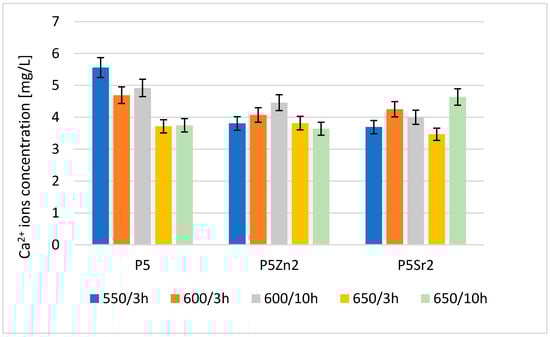 The highest concentration of calcium ions was determined for P5 after treatment at 550 °C/3 h; after the subsequent annealing steps for this bioglass, the amount of released ions was lower. Of the bioglass composed of P5Zn2, the sample released the most Ca2+ ions after annealing at 600 °C/10 h. For this composition, samples treated at lower and higher temperatures released fewer ions. The ions released from the bioglass when in contact with SBF can form amorphous calcium phosphate over a hydrated silicon-rich layer. The tendency of the material to undergo such chemical transformations in the presence of SBF leads to the formation of crystalline calcium phosphate or apatite [31]. However, the amount of calcium ions released from the implanted biomaterial may also affect the initiation of the blood coagulation effect [29]. The results obtained for the release of calcium ions were mainly influenced by the chemical composition and differences in the ionic radii of the elements (Zn < Ca < Sr), which replaced calcium in the P5 bioglass. Although heat treatment at higher temperatures promotes structure ordering and thus increases chemical resistance, in the case of the P5Sr2 bioglass, the highest amount of Ca2+ ions was released for the sample heat-treated at 650 °C for 10 h.