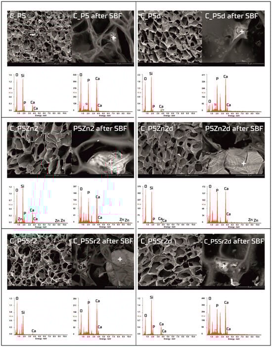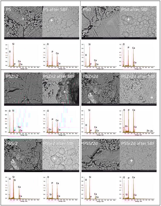 SEM-EDS analysis of bioglasses: P5, P5Zn2, and P5Sr2, and P5d, P5Zn2d, and P5Sr2d before and after 21 days of incubation in SBF solution. Scale bare in SEM pictures is equal to 50 µm.