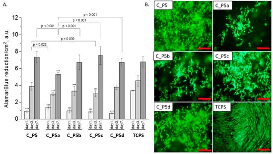 Composites (C_P5, C_P5a, C_P5b, C_P5c, and C_P5d) and MG-63 osteoblast-like cells: metabolic activity tested via AlamarBlue® on days 1, 3, and 7 (A) and live/dead viability staining (green—live cells; red—dead cells) on day 7 (B). Result presented as average ± standard deviation, n = 3; asterisks indicate statistical significance as compared to TCPS for corresponding time point at *** p < 0.001.