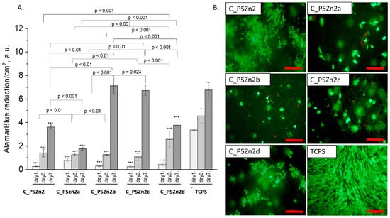 Composites (C_P5Zn2, C_P5Zn2a, C_P5Zn2b, C_P5Zn2c, and C_P5Zn2d) and MG-63 osteoblast-like cells: metabolic activity tested by AlamarBlue® on days 1, 3, and 7 (A) and live/dead viability staining (green—live cells; red—dead cells) on day 7 (B). Result presented as average ± standard deviation, n = 3; asterisks indicate statistical significance as compared to TCPS for corresponding time point at *** p < 0.001.