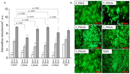Composites (C_P5Sr2, C_P5Sr2a, C_P5Sr2b, C_P5Sr2c, and C_P5Sr2d) and MG-63 osteoblast-like cells: metabolic activity tested by AlamarBlue® on days 1, 3, and 7 (A) and live/dead viability staining (green—live cells; red—dead cells) on day 7 (B). Result presented as average ± standard deviation, n = 3; asterisks indicate statistical significance as compared to TCPS for corresponding time point at * p < 0.05 and *** p < 0.001.