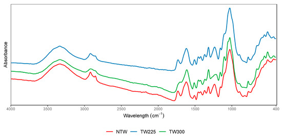 Fourier transform infrared spectra were obtained using an FTIR spectrometer (Bruker Optik, GmbH, Germany) connected to an ATR (attenuated total reflection) module. The spectra were collected over a wavelength range of 400 to 4000 cm−1 and a resolution of 4 cm−1. For each material (non-torrefied and torrefied at 225 °C and 300 °C), 64 scans were performed, and three repetitions were conducted to increase the accuracy of the results and reduce the effect of the atmospheric noise. Average spectra were collected using Opus software (https://www.bruker.com/en/products-and-solutions/infrared-and-raman/opus-spectroscopy-software/downloads.html, accessed on 28 September 2023).