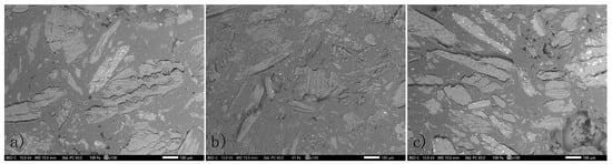 Wooden particles are randomly embedded in the polymer matrix, showing different slenderness. The wood particles were mostly long in shape, suggesting that they were horizontally oriented. However, often, the porous wooden structure can be observed. The difference between the samples (Figure 3) and the difference in the mean particle size (Table 2) is not clear in the images. The incorporation of wooden particles is also often loose from the matrix, indicating poor adhesion between the particles. It can also be observed that the wooden particles often collapse, and cell lumens are compressed together due to the high density of the material. The formation of aggregates was also observed in all samples, likely due to the poor distribution of the filler during the preparation process. Moreover, a void in the polymeric matrix was detected in Figure 3c, which can be attributed to the formation of air bubbles within the polymer during the blending process.