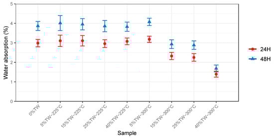 Results of water absorption (WA) after 24 h and 48 h of immersion in water are presented in Figure 4.