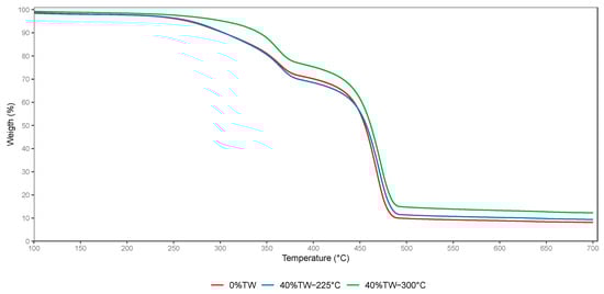 TGA thermograms of 0%TW, 40%TW-225 °C, and 40%TW-300 °C.