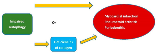 The deficiencies of collagen or autophagy could potentially contribute to the pathogenesis of myocardial infarction, RA, and periodontitis.