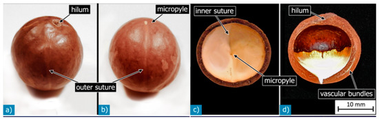 Botanical nomenclature of macadamia nutshell. (a,b) Outer layer; (c,d) Innermost layer. Reprinted with permission from Ref. [14]. Copyright 2014, Schuler et al.