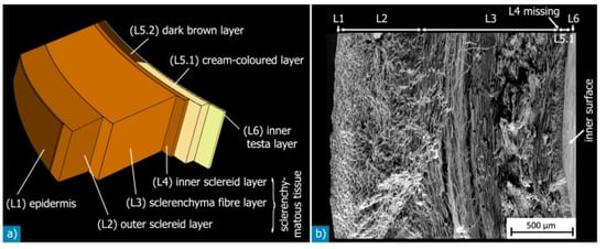 Complex structures of macadamia nutshell. (a) Schematic illustration of these layers; (b) SEM image of a cross section where layers are visible and have been classified. Reprinted with permission from Ref. [14]. Copyright 2014, Schuler et al.