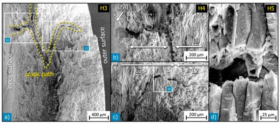 SEM images on Crack propagation in macadamia seed coat. (a) Compressed loading on samples; (b) Enlarged view showing interfacial fracture deflection between sclerenchymatous layer (L3) and sclereid layer (L4); (c,d) Ending of crack. Reprinted with permission from Ref. [14]. Copyright 2014, Schuler et al.