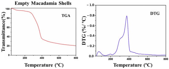 To investigate the thermal behavior of macadamia nutshells, Sagar et al. [15] performed thermo-gravimetric analysis (TGA), derivative thermo-gravimetric (DTG) analysis, and pyrolysis experiments on empty nutshells (Figure 8). TGA tests involved measuring the mass of the samples as a function of temperature. During TGA, changes in mass occur due to sublimation, evaporation, decomposition, chemical reactions, and magnetic or electrical transformations, providing insights into the thermal stability of the material. The presence of acetyl groups makes hemicellulose the least thermally stable component, leading to its decomposition at around 300 °C, as observed via the initial weight loss. Cellulose degradation occurs rapidly around 400 °C, indicated by a characteristic peak on the DTG curve (at approximately 370 °C). Lignin degradation, on the other hand, takes place at lower temperatures and spans a wider temperature range. At the end of the TGA analysis, the macadamia nutshells left behind a residue of approximately 20%.