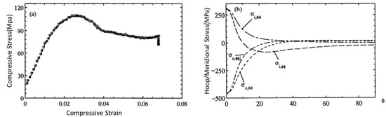The stress–strain curve and elastic stress distribution curve were evaluated (Figure 9). Stresses in the shell were designated as meridian and hoop stresses adopting a geophysical analogy by Jennings et al. [16].