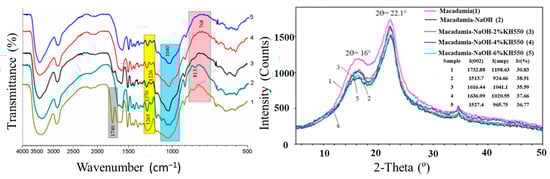 The FTIR spectra of representatives: (1) MS; (2) NaOH-treated MS; (3) NaOH + 2 wt% KH550-treated MS; (4) NaOH + 4 wt% KH550-treated MS; (5) NaOH + 6 wt% KH550-treated MS. Reprinted/adapted with permission from Ref. [27]. Copyright 2020, Xiaohui et al.