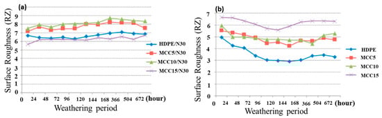 Surface roughness of composite representatives: (a) Nutshell/ MCC-reinforced composites and (b) MCC-reinforced composites along with weathering period. Adapted with permission from Ref. [29]. Copyright 2021, Sevda et al.