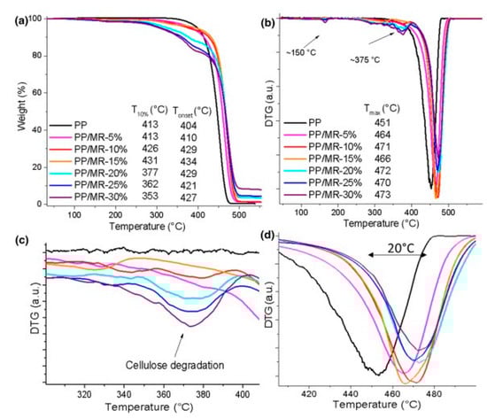 Thermogravimetric curves of pure PP and MR composites in several ratios. (a) The TGA graphs of pristine PP and its composites; (b) Respective DTGS; (c,d) Cellulose degradation pattern. Adapted with permission from Ref. [31]. Copyright 2021, Lucas et al.
