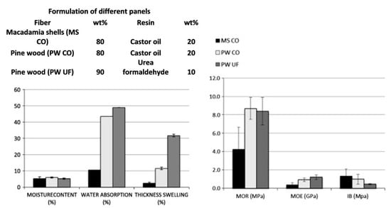Wechsler et al. [33] conducted a study comparing particleboards made from macadamia nutshells with resin derived from castor oil to conventional wood fiber/urea formaldehyde particleboards. The macadamia nutshell particleboards exhibited a 43% higher density, lower moisture retention, and reduced swelling. The internal bond strength was similar, but the modulus of rupture and modulus of elasticity were slightly lower compared to those of the conventional particleboards. Figure 14 presents the relevant data recorded in the study. Furthermore, the particleboards made with castor oil resin emitted less than 5% formaldehyde compared to traditional urea formaldehyde particleboards.