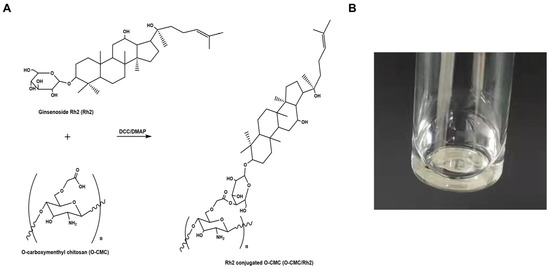 (A) Schematic of ginsenoside Rh2-conjugated O-carboxymethyl chitosan (O-CMC/Rh2), (B) image of the aqueous solution of O-CMC/Rh2.