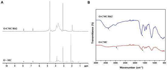 Figure 2A shows the 1H NMR spectra of O-CMC and O-CMC/Rh2. The D2O peak at 4.85 ppm was used as the reference peak. As expected, the 1H-NMR spectrum of O-CMC/Rh2 showed characteristic peaks corresponding to O-CMC and Rh2 (0–2 ppm [25]), exhibiting successful conjugation of O-CMC and Rh2. The degree of substitution (DS) of Rh2 can be calculated based on the integration ratio of the proton peak from the methyl group of Rh2 to that of the −OCH2=O− peak of O-CMC, showing the Rh2 conjugation with a DS of 4.98.