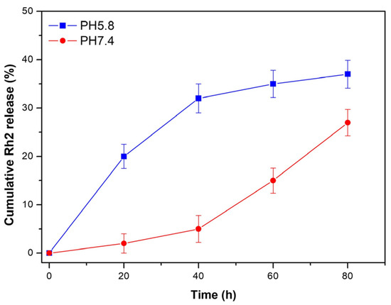 The in vitro cumulative release profile from O-CMC/Rh2 at different pH buffers (pH 7.4 and pH 5.8) was investigated to evaluate its effectiveness in the drug delivery system. Generally, the in vivo environment becomes less acidic during an inflammatory infection, thus two pH conditions were chosen to compare its cumulative release profile. The cumulative Rh2 released from O-CMC/Rh2 matrix under physiological conditions (pH 7.4) and pathophysiological conditions (pH 5.8), as is shown in Figure 4. It can be seen that the release rate of Rh2 under pathophysiological conditions (pH 5.8) is faster at the early stage, and becomes slow at around 40 h. On the contrary, the release rate of Rh2 under physiological condition (pH 7.4) is relatively slow before 40 h, and it becomes faster at around 40 h. It may be that the ester bond between O-CMC and Rh2 can be easily broken in slightly acidic conditions, causing a large amount of Rh2 to release at the initial stage at a pH of 5.8. However, it takes much more time to break the ester bond under physiological conditions (pH 7.4), thus the release rate at the initial stage is slower than that up to 40 h. Figure 4 shows that the cumulative Rh2 release from O-CMC/Rh2 at pH 5.8 is higher than that at pH 7.4, which is consistent with the explanation described above. These results indicate that O-CMC/Rh2 is a pH-dependent sustained release matrix, providing a potential application as a drug delivery system of O-CMC/Rh2.