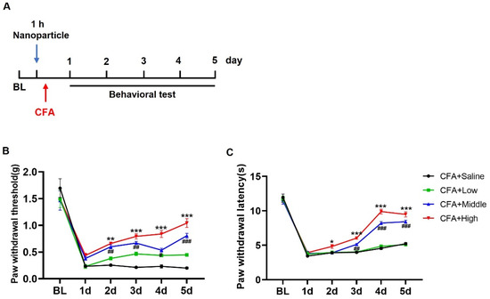The CFA-induced inflammatory pain model was established as described previously [22]. After mice were anesthetized with isoflurane (2%, RWD Life science, San Diego, CA, USA), 20 μL CFA (100%; Sigma-Aldrich, St. Louis, MI, USA) was injected into the mice’s paws to induce inflammatory pain. Control mice were injected with the same amount of saline in their paws. The nanoparticles were dissolved in saline and intrathecally injected into the L5 and L6 spinal cord intervertebral spaces to deliver the reagents to cerebrospinal fluid. All groups of mice were allowed to acclimatize to the home cage and environment. After the CFA injection, all groups of mice underwent a nociceptive behavior test (von Frey Hair test and Hargreaves test) for 72 h.