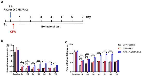 Rh2 is a small lipid-soluble molecule with a high diffusion rate and low biological availability in the body [27]. We wanted to know whether O-CMC confusion could improve the biological availability of Rh2 in vivo. Therefore, we compared the analgesic durations of Rh2 and O-CMC/Rh2. As for the CFA injection-induced inflammatory pain, pain behavior was measured for seven consecutive days (Figure 6A). At d1 and d2 after injection, Rh2 (10 μM) and O-CMC/Rh2 (10 μM) significantly relieved the mechanical hyperalgesia and heat pain caused by inflammation in the mice (Figure 6B,C). The analgesic effect of Rh2 lasted for only 48 h; however, the relief effect of O-CMC/Rh2 on mechanical pain was maintained until d7, and the relief effect on thermal pain was maintained until d6 (Figure 6B,C). These results indicated that O-CMC/Rh2 had a longer analgesic effect in vivo than Rh2.