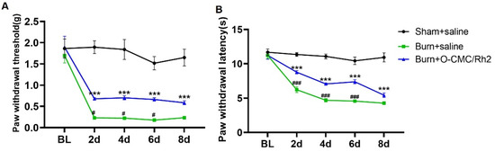 O-CMC/Rh2 attenuates burning injury-induced paw mechanical allodynia and thermal hyperalgesia. (A) Comparison of paw mechanical allodynia and (B) thermal hyperalgesia among Sham, burn + saline, and burn + O-CMC/Rh2 nanoparticle (10 μM) groups. Two-way analysis of variance (Two-way ANOVA) was employed. n = 6 mice/group. *** p < 0.001, Sham vs. burn + saline group, ### p < 0.001, burn + saline vs. burn + O-CMC/Rh2 nanoparticle group.