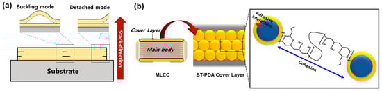 (a) Schematic of delamination mode of a cover layer. (b) BT/PDA composite structure in the cover layer of an MLCC.