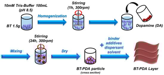 BaTiO3 (80 nm) was added to 100 mL of a 10 mM Tris(hydroxymethyl)aminomethane solution (Tris-buffer, pH 8.5) for 1 h at 300 rpm. DA hydrochloride was then added to the homogenized BT solution and mixed for 24 h at 300 rpm. The DA-treated BT solution was washed 2 times with deionized water using a centrifuge and was then washed with ethanol. To obtain the BT/PDA particles, the solution was dried in an oven for 24 h at 100 °C. The binder solution was fabricated using PVB resin and a mixture of ethanol and toluene. The binder solution was sonicated for 2 h to achieve the target viscosity. The BT/PDA slurry was prepared by mixing the BT/PDA particles, binder solution, additives, dispersant, and solvent. A BT/PDA layer of 20 μm thickness was fabricated on the polyethylene terephthalate (PET) film with a doctor blade (Figure 2). The preparation of the BT layer followed a similar protocol as that used in the preparation of BT/PDA with the exception of PDA.