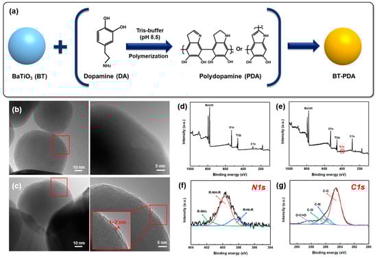 Surface analysis of BT and PDA-treated BT. (a) Self-polymerization mechanism of DA. HR-TEM image of the (b) BT and (c) BT/PDA particles. XPS spectra of (d) BT and (e) BT/PDA. High-resolution (f) N1s and (g) C1s spectra of BT/PDA surfaces.