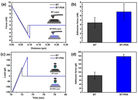 Adhesion force of the BT and BT/PDA layers. (a) F−D curves of the BT−BT and BT/PDA−BT/PDA layers. (b) Adhesion force values calculated from the F−D curves in (a). (c) Ball probe tack test of the BT and BT/PDA layers. (d) Adhesion forces calculated from the load vs. time curve in (c).