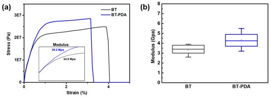 Moduli of the BT and BT/PDA layers. (a) Stress–strain curves of the BT and BT/PDA layers. The inset shows the tensile modulus values of the BT and BT/PDA layers. (b) Compression moduli of the BT and BT/PDA layers.