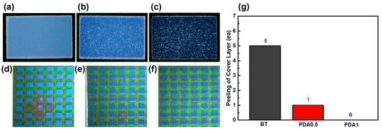 Surface of the (a) BT, (b) PDA0.5, and (c) PDA1 cover layers for an MLCC. Surfaces of the (d) BT, (e) PDA0.5, and (f) PDA1 cover layers for an MLCC after the pull-off test. (g) Peeling of the cover layer for BT, PDA0.5, and PDA1. The red circles show MLCC with the cover layer peeled off and the inner layer exposed.