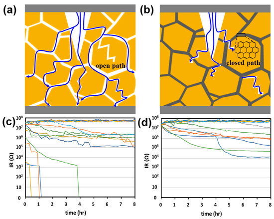 Moisture resistance. Schematic of (a) direct and (b) tortuous paths of the cover layer of an MLCC. IR degradation of (c) BT and (d) PDA1. The color lines represent each MLCC mounted on the board.