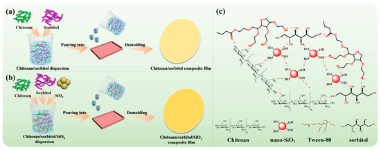 Preparation process diagram of the (a) chitosan/sorbitol composite films, and (b) chitosan/sorbitol/SiO2 composite films. (c) The structural scheme of the interaction between chitosan, sorbitol, Tween-80 and nano-SiO2.