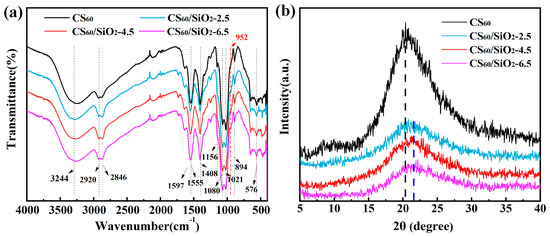 To investigate the structural differences between the chitosan-based composite films with and without SiO2, IR spectra were recorded. The FTIR spectra of CS60 and CS/sorbitol/SiO2 composite films are shown in Figure 2a. From the FTIR spectra curve of the CS60 composite film, it can be seen that 3244 cm−1 is the hydroxyl (O-H) stretching vibration absorption peak, and the peaks at 2921 cm−1 and 2882 cm−1 correspond to the two C-H stretching vibration absorption peaks. The absorption peak of the amide II band (N-H bending vibration) is found at 1597 cm−1; 1408 cm−1 corresponds to the bending and deformation absorption peaks of =CH2 and -CH3; 1156 cm−1 is the C-O stretching vibration absorption peak of the β-glucoside bond; 1080 cm−1 and 1021 cm−1 are the two stretching vibration absorption peaks of C-O. In the fingerprint area, 894 cm−1 corresponds to the absorption peak of C-O stretching vibration [30,31].