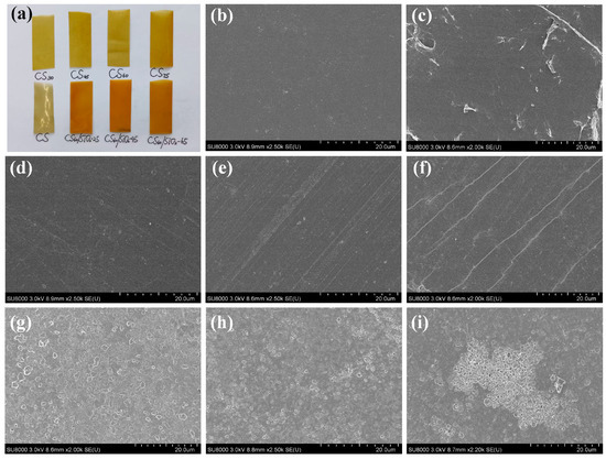 (a) Optical image of chitosan-based composite films. SEM photomicrographs of (b) CS, (c) CS30, (d) CS45, (e) CS60, (f) CS75, (g) CS60/SiO2-2.5, (h) CS60/SiO2-4.5; (i) CS60/SiO2-6.5.