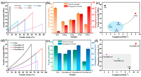 (a) Stress–strain curves, (b) bar chart of tensile strength and elongation at break, (c) toughness–tensile strength scatter plot of chitosan/sorbitol composite films. (d) Stress–strain curves, (e) bar chart of tensile strength and elongation at break, (f) toughness–elongation at break scatter plot of chitosan/SiO2 composite films.