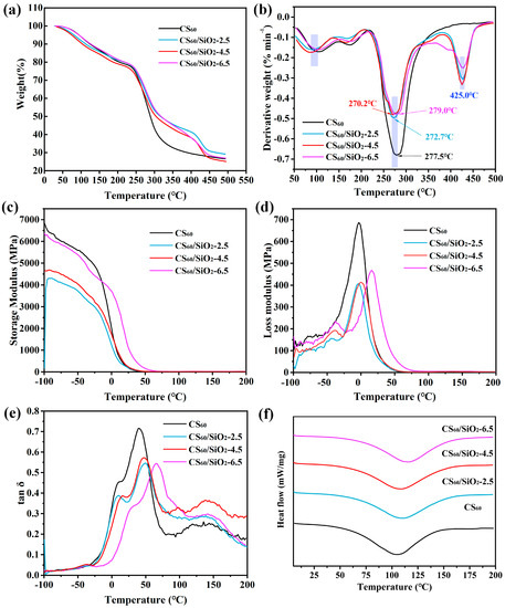 A single endothermic peak in the range of 75–150 °C can be seen in DSC curves, as shown in Figure 5f, corresponding to non-freezing water locked in the amorphous region of the chitosan matrix [67]. Both amino and carboxyl groups can easily bind to water molecules in chitosan, and the water bound by the amino group evaporated faster than that held by carboxyl groups [65]. After the addition of hydrophilic nano-SiO2 containing a large number of hydroxyl groups, the water locked in the matrix evaporated more slowly, which explains the increase in the endothermic peak.