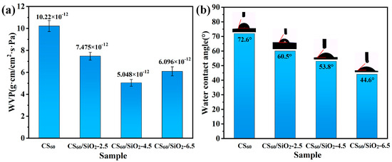 The surface water contact angle is an important parameter reflecting the wetting characteristics of film materials. When a droplet forms on a solid surface, wetting occurs. The droplet first contacts the substrate, forming a solid–liquid–gas three-phase contact line. Then, the three-phase contact line continues to move forward and is stable or metastable at a certain radius. The WCA values of chitosan composite films without nano-SiO2 and with different amounts of nano-SiO2 are shown in Figure 6b. The WCA value of the CS60 film is 72.6 ± 0.83°, which is higher than that of the chitosan composite film containing nano-SiO2: CS60/SiO2-2.5 (60.5 ± 0.54°), CS60/SiO2-4.5 (53.8 ± 0.75°), CS60/SiO2-6.5 (44.6 ± 0.69°).