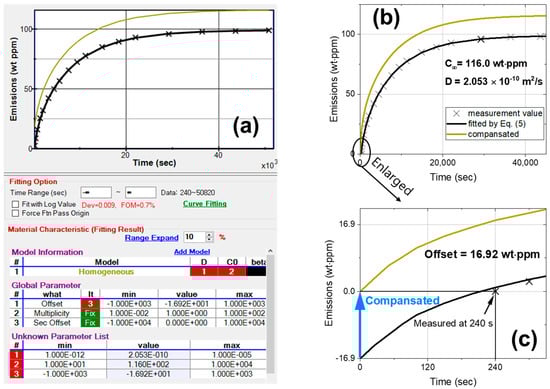 (a) Diffusion analysis program for evaluating the emission content and diffusivity of hydrogen using Equation (5); (b) measurement data (marked with ×) fitted by Equation (5) (black line) and the offset-compensated result (yellow line); (c) enlarged graph of the compensation.