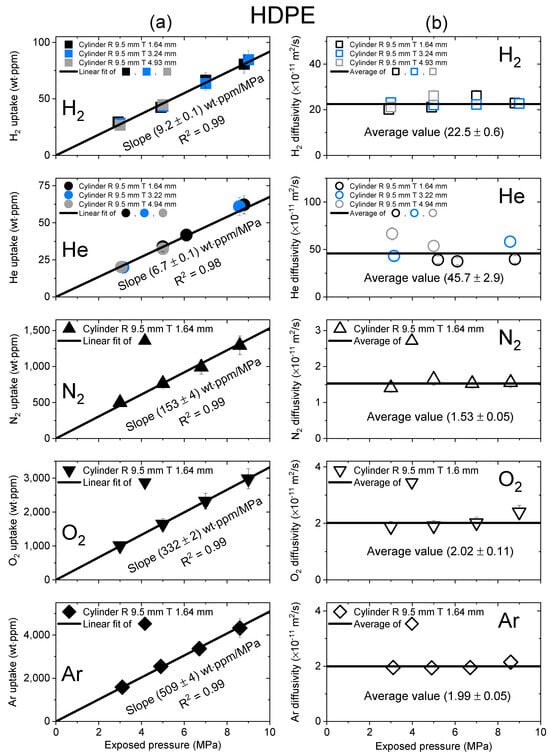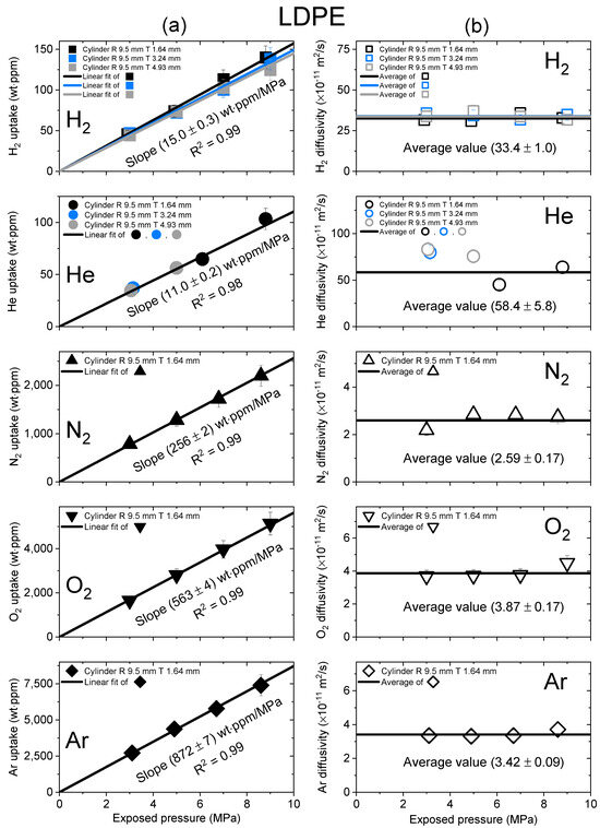 Figure 3 shows the gas uptake and diffusivity of LDPE as a function of exposed pressure for five distinct gases. As shown in Figure 3a, the black, blue and gray lines fitted to the gas uptake data had square correlation coefficients of R2 > 0.99, indicating that LDPE absorbed the gas molecules in their molecular state without undergoing dissociation or chemical reactions. As shown in Figure 3b, the diffusivity did not exhibit a substantial dependence on the exposed pressure. Thus, the average diffusivity was used, as indicated by the black horizontal line. The black error bars in uptake and diffusivity represented the expanded measurement uncertainty of 10%, as estimated in an earlier study [27]. The two hydrogen results in Figure 3a,b show comparisons of the uptake and diffusivity values for LDPE samples with varying thicknesses. The hydrogen gas uptake and diffusivity values coincided within measurement uncertainty, regardless of sample thickness. Thus, the slope of hydrogen gas uptake for the exposed pressure was equal to the average slope value (15.0 ± 0.3 wt∙ppm/MPa), and the diffusivity was equal to the average value of the data points with different thicknesses.