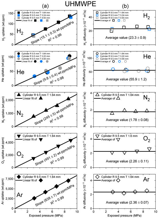 Figure 3, Figure 4 and Figure 5 show the gas uptake/diffusivity versus the exposed pressure in LDPE, UHMWPE and HDPE, respectively, for the five gases. The gas uptakes and diffusivities were determined by applying Equation (5) to a diffusion analysis program in Figure 2. All gas uptakes followed Henry’s law up to pressures of 9 MPa, which was consistent with previous investigations [19,27,36]. The slope of the gas uptake data line regarding exposed pressure provided the Henry’s law constant.