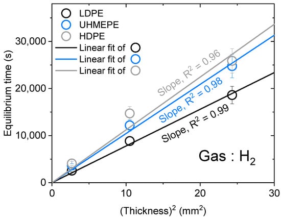 In Figure 6, the linear correlation passing the origin of the equilibrium time vs. the square of the sample thickness had an R2 value greater than 0.96, indicating a correlation between these two parameters. Thus, even if the sample thickness was different, the measurement results (gas uptake/diffusivity) were constant.