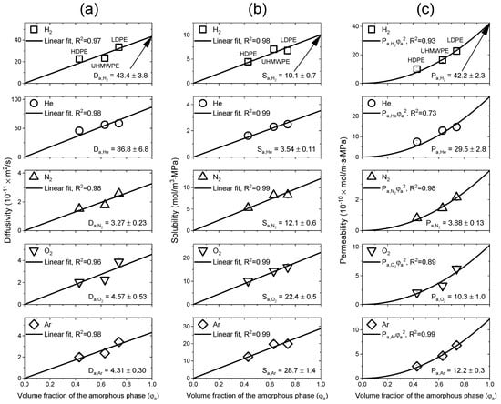 Process of calculating the diffusivity, solubility and permeability values of the 100% amorphous PE for the five test gases: (a) Linear fit of the diffusivity for the volume fraction of the amorphous phase via Equation (10); (b) linear fit of the solubility for the volume fraction of the amorphous phase via Equation (9); (c) quadratic fit of the permeability for the volume fraction of the amorphous phase via Equation (11).