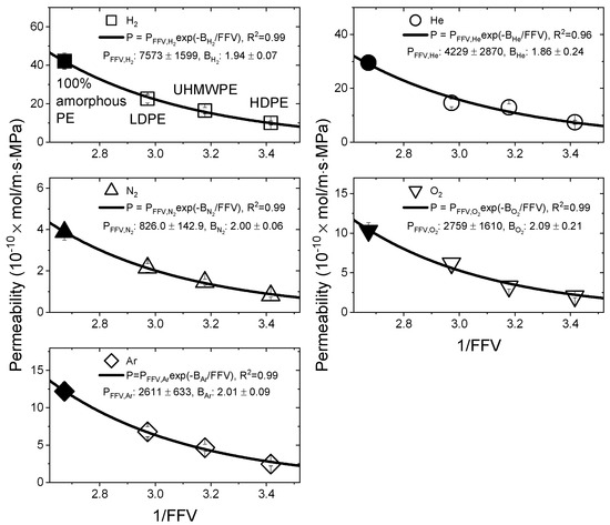Correlation between the permeability and reciprocal fractional free volume values for PE materials. The and values computed by Equation (13) for the test gases are shown in the graph. The black-filled symbols indicate the values calculated by Equation (11).