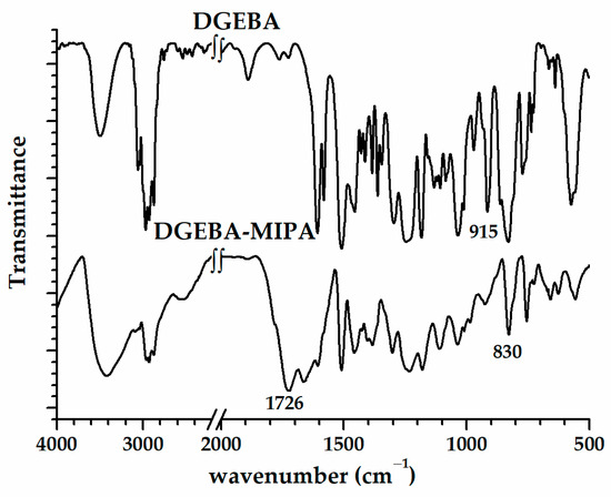 The absence of the absorption peak of an oxirane ring (915 cm−1 in DGEBA) was the main indication of the occurrence of the addition reaction between the carboxylic acid groups of MIPA and the oxyrane groups of DGEBA [40,42,44]. The presence of the anhydride ring in the final resin is confirmed by the presence of the peaks associated with the carbonyl groups (1726 cm−1) and—C=C– linkage (830 cm−1), both belonging to the cyclic imide group [39,40,41,45].