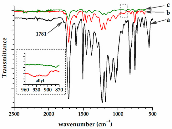 FTIR spectra of DGEBA-Anth (a), DGEBA-allyl-Anth (b), and DGEBA-allyl-Anth 300 (c). The inset figure details the signals of the allyl groups.