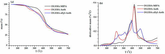 The results of the conventional TGA, expressed in the evolution of the sample mass and its temperature derivative (DTGA), are represented in Figure 3a,b. Also, Table 1 contains the main thermal characteristics of the samples of the DGEBA-MIPA, DGEBA-Anth, and DGEBA-allyl-Anth. The values of the onset degradation temperature are much lower for the samples with anthracene than for the sample DGEBA-MIPA (Table 1). The DTGA curve of the sample DGEBA-Anth exhibited a sharp peak centered at 215 °C, which can be associated with the cleavage of the Diels–Alder adduct maleimide-anthracene (Figure 3a).